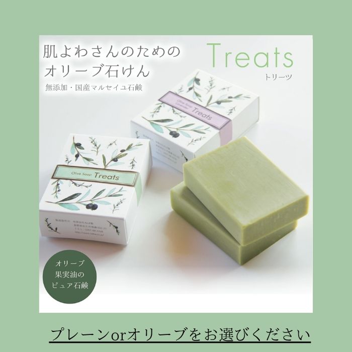 新商品 パーム不使用で肌よわさんや赤ちゃん、産前産後の妊婦の方でも安心して使える石鹸、オリーブ石けん 「Treats トリーツ」 が発売されました。 直接購入と楽天市場のみでのお取り扱いになりますが、オーガニックエキストラバージンオリーブ油のみを使用した、伝統のマルセイユ石鹸製法で焚き上げた石鹸素地を機械練りでより密度の高い石鹸に仕上げた、日本初の機械練りマルセイユ石鹸になります。 オリーブ油特有のきめ細かい優しい泡で超しっとり洗いあげてくれます。 是非お試しください。